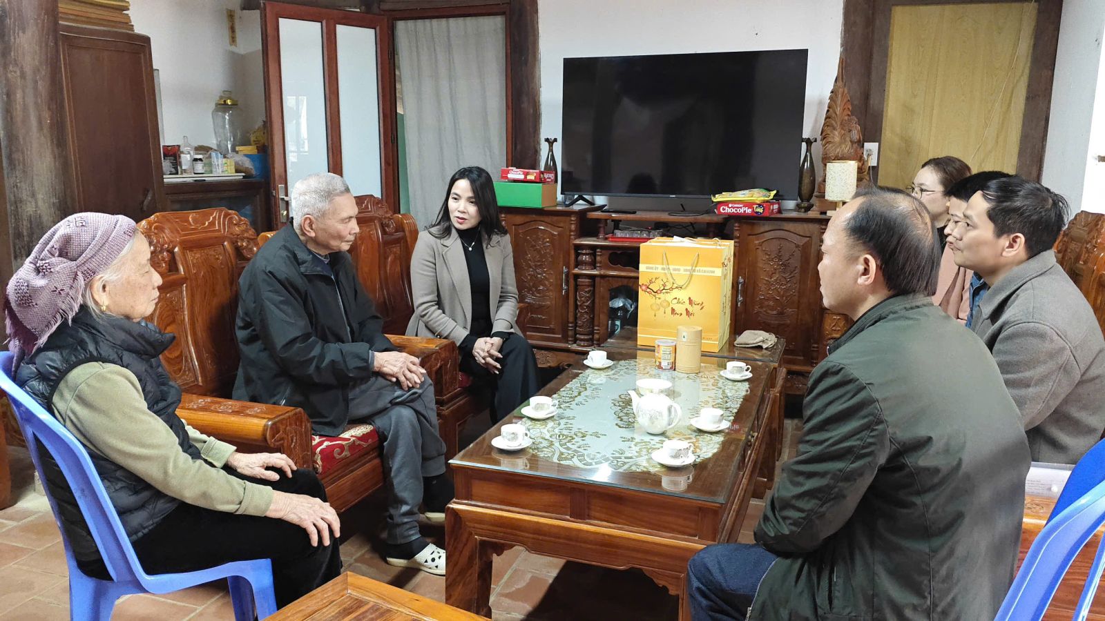 Đoàn đã đến thăm, chúc tết và tặng quà Bà Nguyễn Thị Thành, vợ liệt sĩ Phan Văn Thống; Ông Phạm Ngọc Điển, Thương binh; Ông Quách Gia Yên, Nguyên Bí thư Đảng ủy; Ông Quách Minh Vương, Nguyên Phó Bí thư Thường trực Đảng ủy, Chủ tịch HĐND xã, cùng trú tại chôn Chục Quan; Ông Lộc Văn Hoà, người có uy tín; Bà Hoàng Thị Mùi, vợ liệt sĩ Lý Văn Chung; Bà Triệu Thị Phan, mẹ liệt sĩ Hoàng Văn Việt, Thôn Ao Sen. Ông Triệu Đức Chính, Nguyên Phó Bí thư Đảng ủy, Chủ tịch UBND xã; Ông Hà Văn Hiên, Nguyên Phó Bí thư Đảng ủy Chủ tịch UBND xã. Tại các gia đình đến thăm, thay mặt đoàn Đồng chí Phó Bí thư Thường trực Đảng uỷ xã, đã ân cần thăm hỏi sức khỏe, đời sống, bày tỏ lòng tri ân sâu sắc đối với những đóng góp, cống hiến của các cá nhân, gia đình đối với sự nghiệp cách mạng và sự phát triển của địa phương; đồng thời chúc các gia đình đón Tết cổ truyền đầm ấm, vui tươi, hạnh phúc.