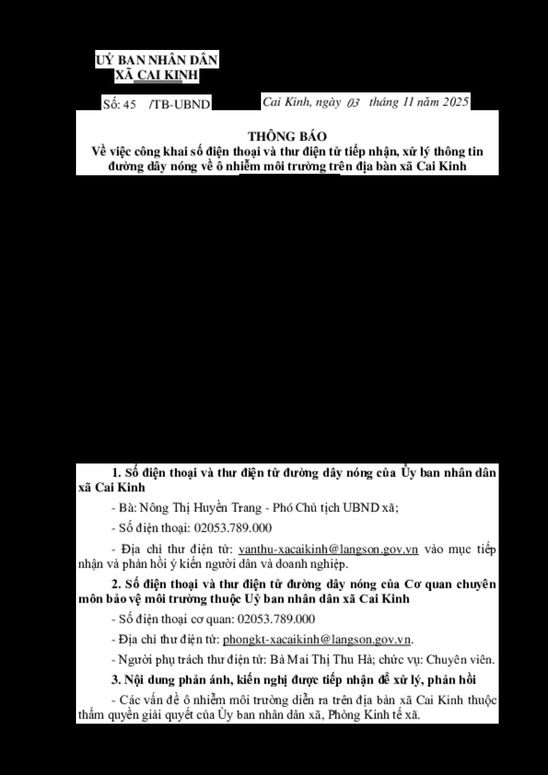 | Tiêu đề văn bản | Thông báo về việc công khai số điện thoại và thư điện tử tiếp nhận, xử lý thông tin đường dây nóng về ô nhiễm môi trường trên địa bàn xã Cai Kinh | ||