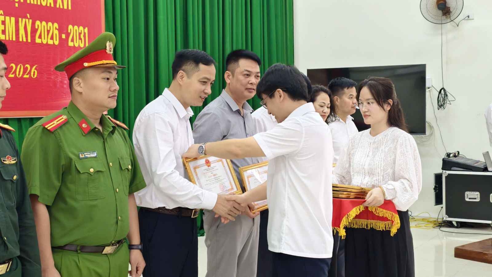 Đồng chí Hà Vũ Khôi, Phó Bí thư Đảng uỷ, Chủ tịch UBND xã trao giấy khen cho các tập thể có thành tích xuất sắc trong công tác bầu cử