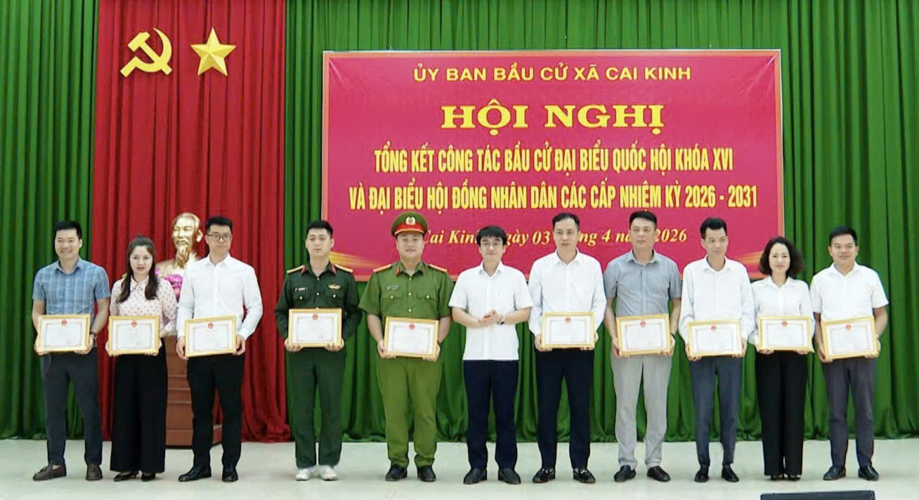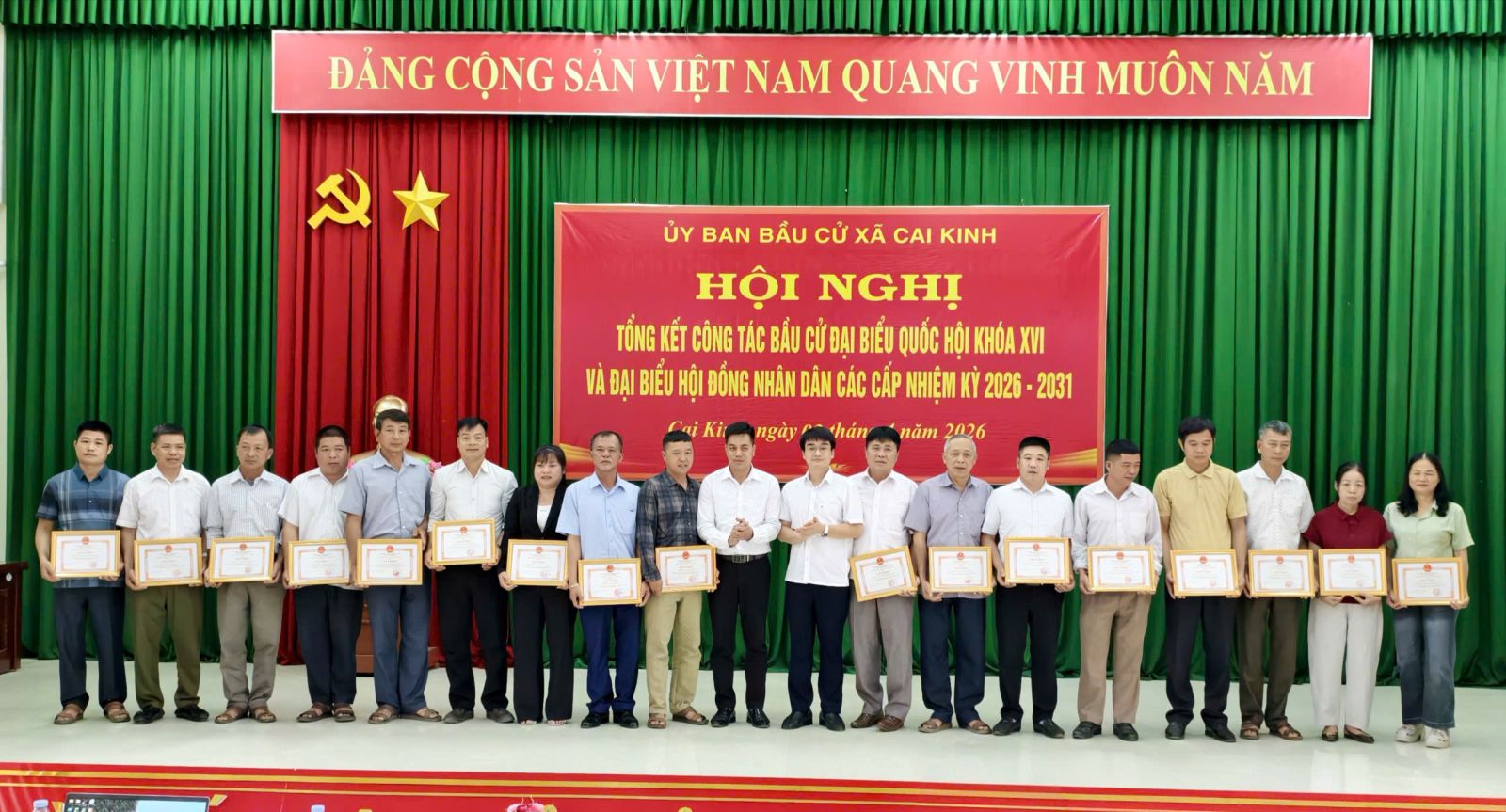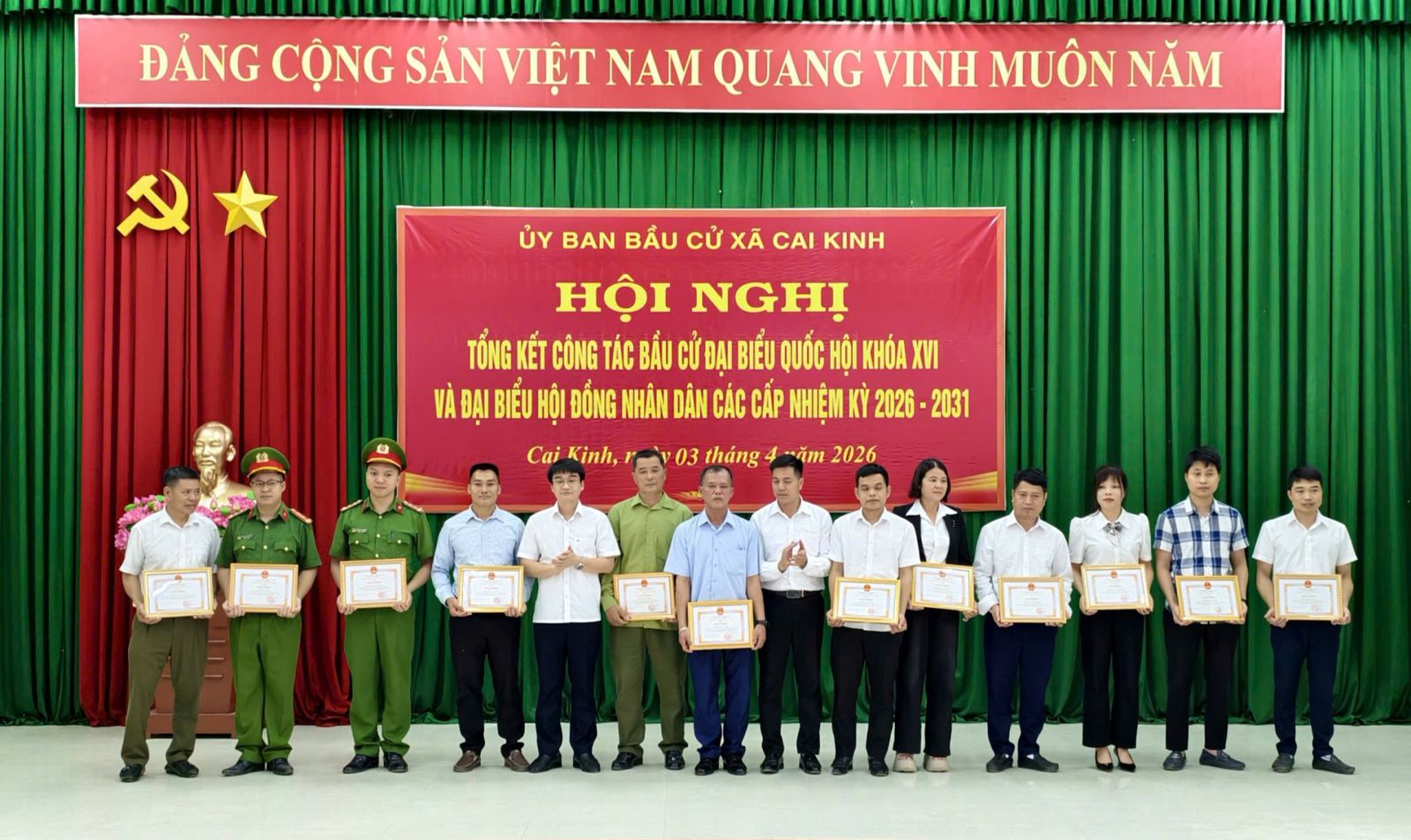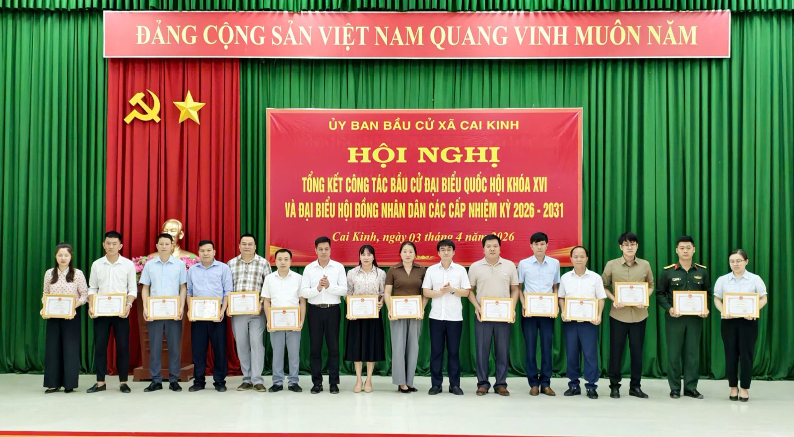 Nhân dịp này, Ủy ban bầu cử xã Cai Kinh đã trao giấy khen cho 28 tập thể và 51 cá nhân có thành tích xuất sắc trong công tác bầu cử Đại biểu Quốc hội khóa XVI và Đại biểu HĐND các cấp nhiệm kỳ 2026 – 2031.