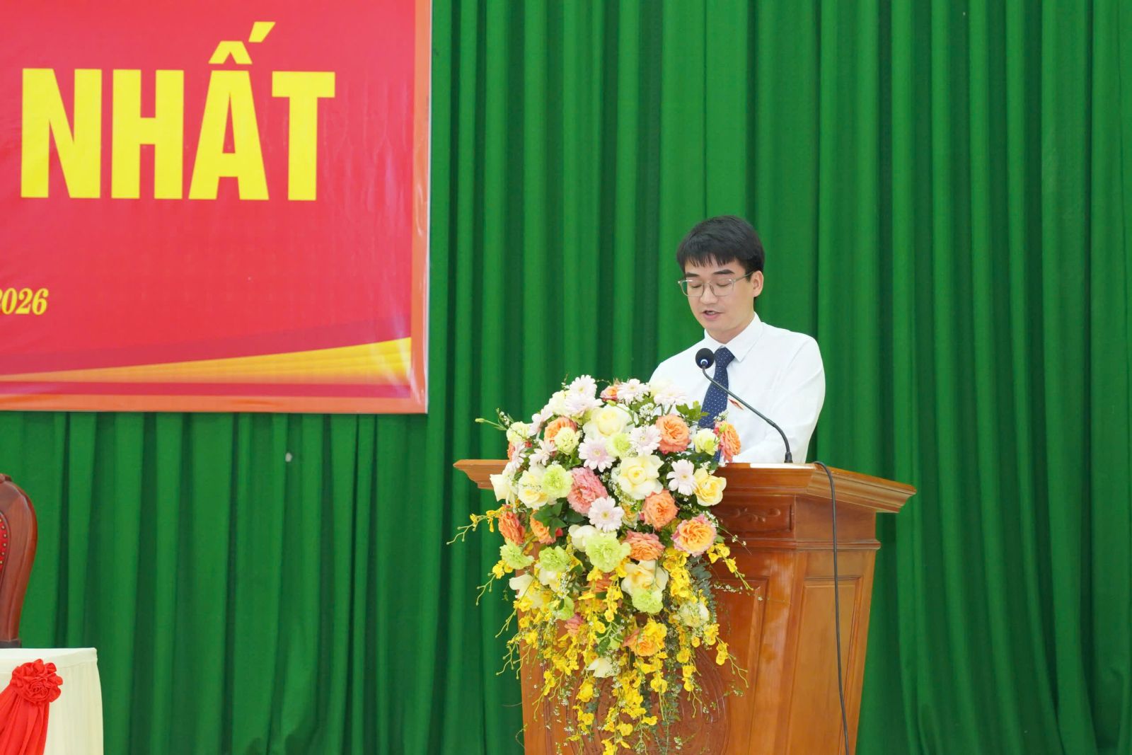 Đồng chí Hà Vũ Khôi, Phó Bí thư Đảng uỷ, Chủ tịch UBND xã trình bày báo cáo kết quả bầu cử đại biểu HĐND xã khóa XXI, nhiệm kỳ 2026–2031