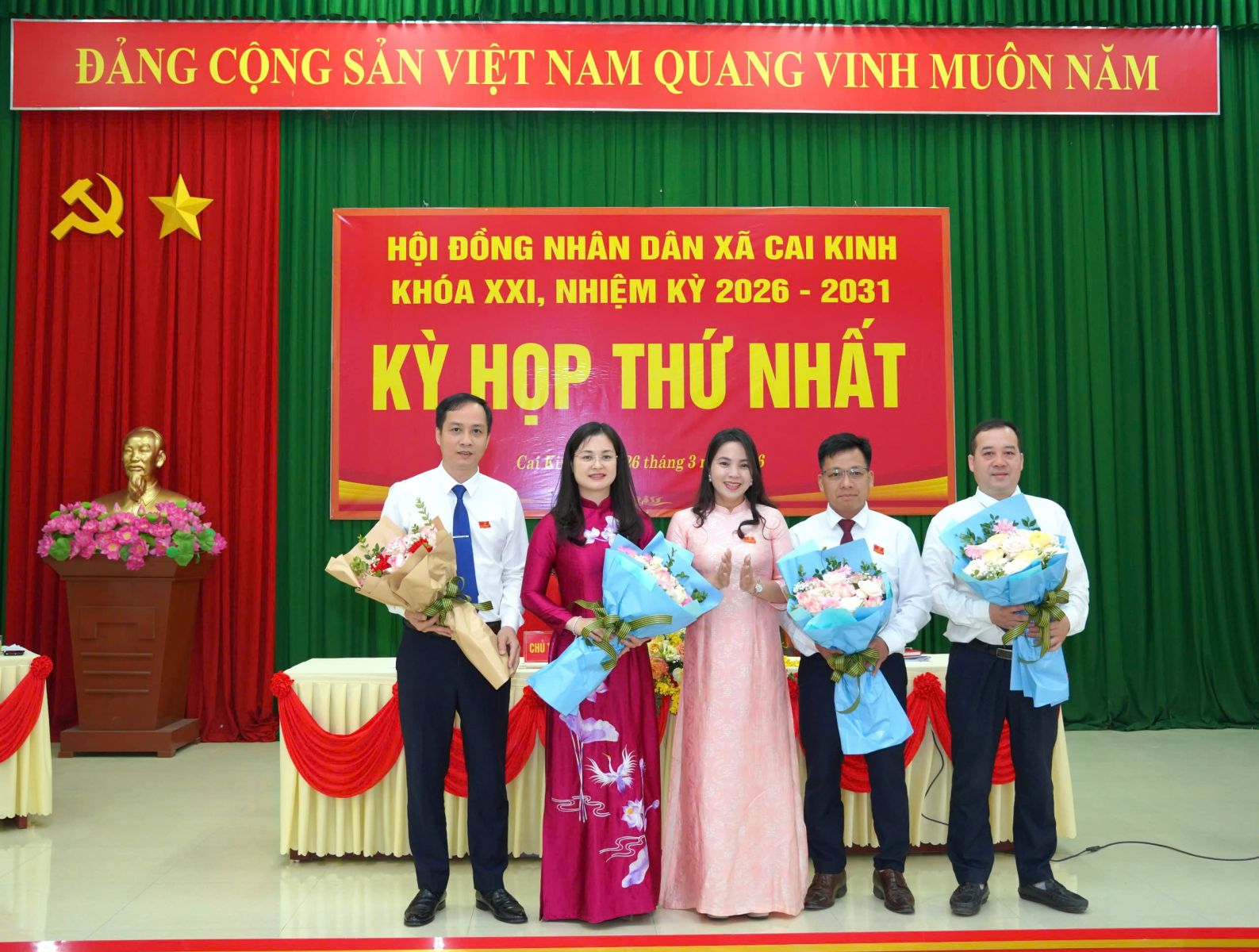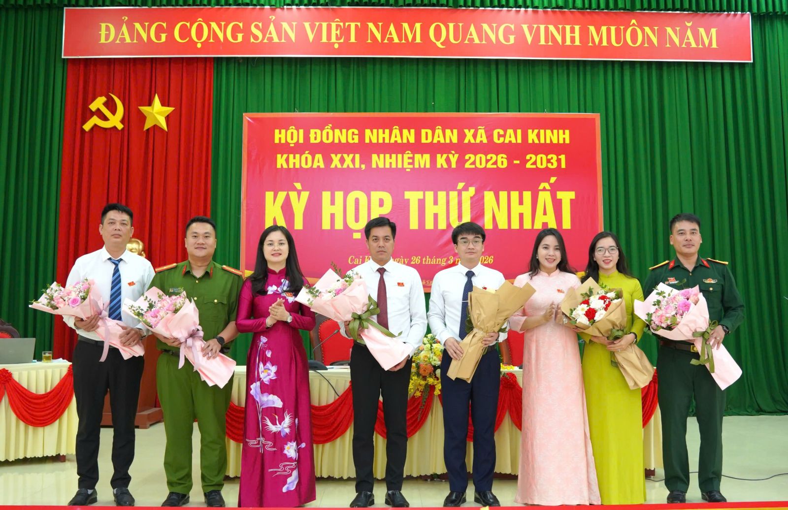 Lãnh đạo Đảng uỷ xã tặng hoa chúc mừng các đồng chí được bầu giữ các chức danh Chủ chốt UBND xã Cai Kinh và các thành viên Uỷ viên UBND xã Cai Kinh khoá XXI, nhiệm kỳ 2026-2031