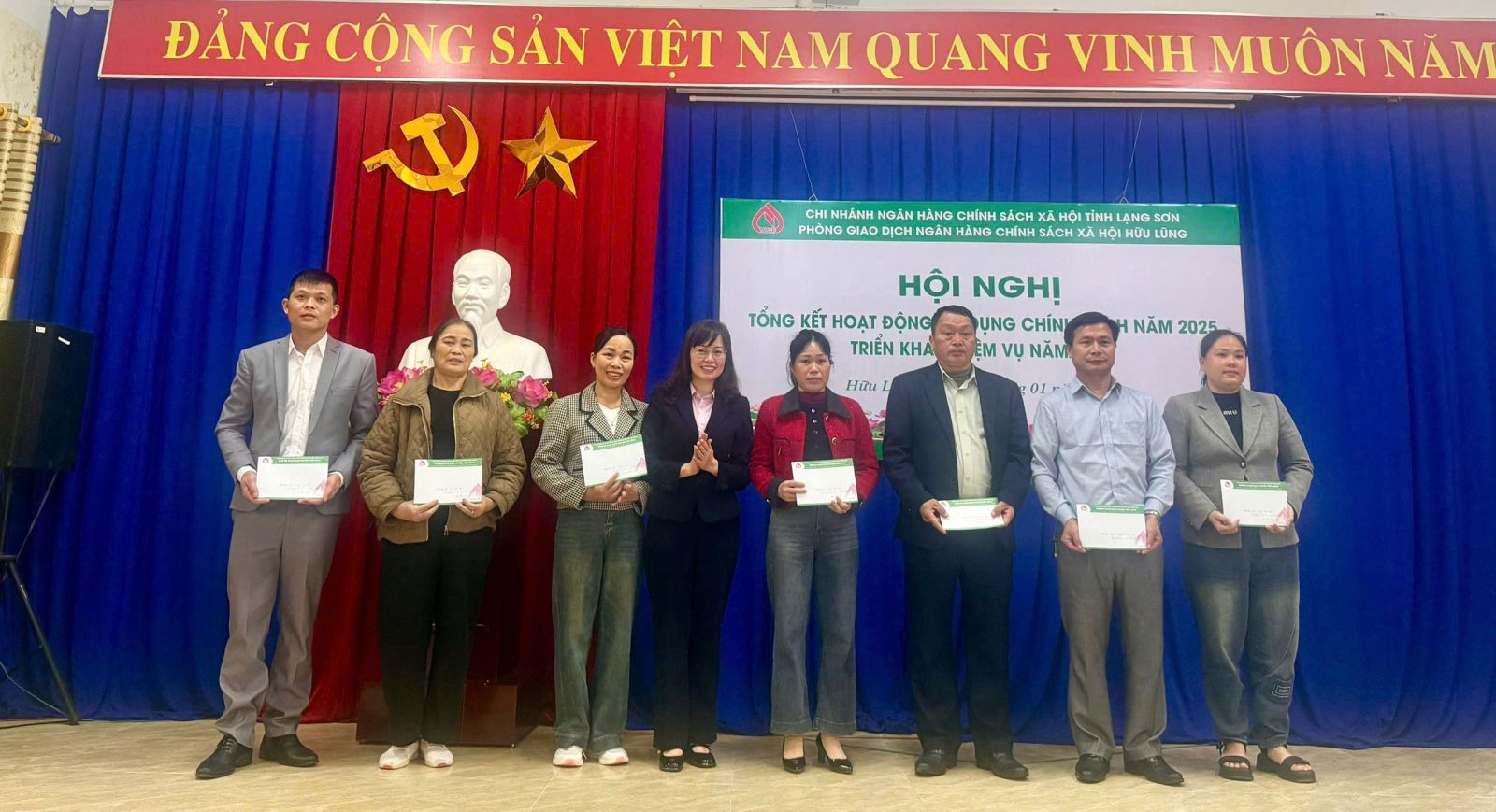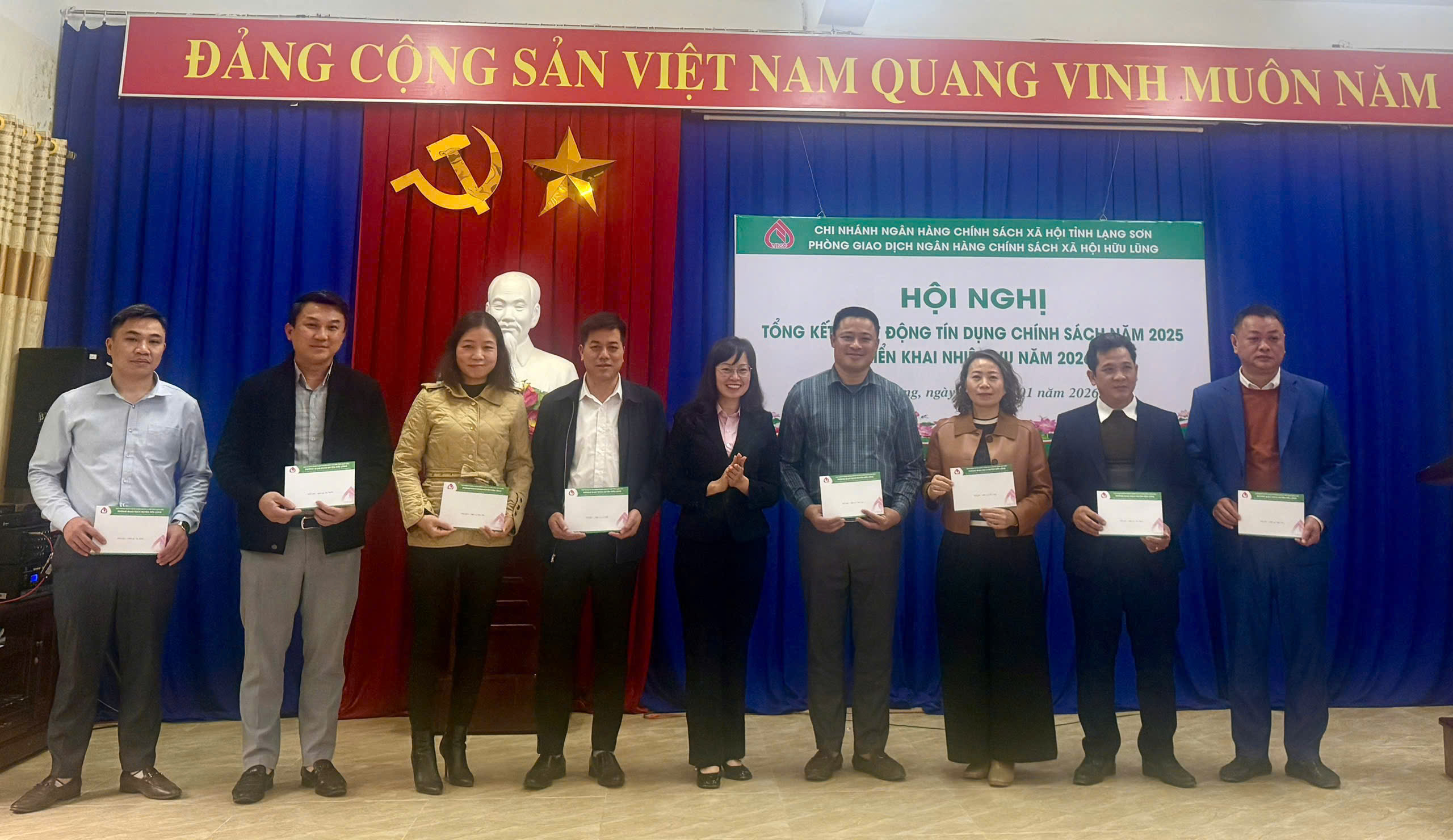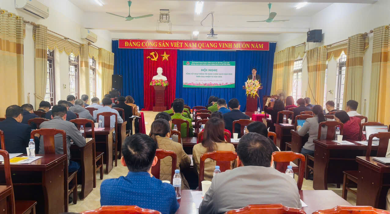 Chiều 26/01/2026 Phòng giao dịch Ngân hàng Chính sách xã hội (NHCSXH) Hữu Lũng tổng kết hoạt động tín dụng chính sách xã hội năm 2025 và triển khai nhiệm vụ năm 2026. Tham dự hội nghị có đại diện lãnh đạo UBND, Chủ tịch Uỷ ban MTTQ Việt Nam, Công an, tổ chức chính trị xã hội các xã Hữu Lũng, Cai Kinh, Thiện Tân, Tân Thành, Hữu Liên, Yên Bình, Tuấn Sơn, Vân Nham. Dự và chỉ đạo hội nghị có đồng chí Lê Thị Nguyệt Nga, Phó Bí thư Đảng uỷ, Phó Giám đốc Chi nhánh NHCSXH tỉnh Lạng Sơn.