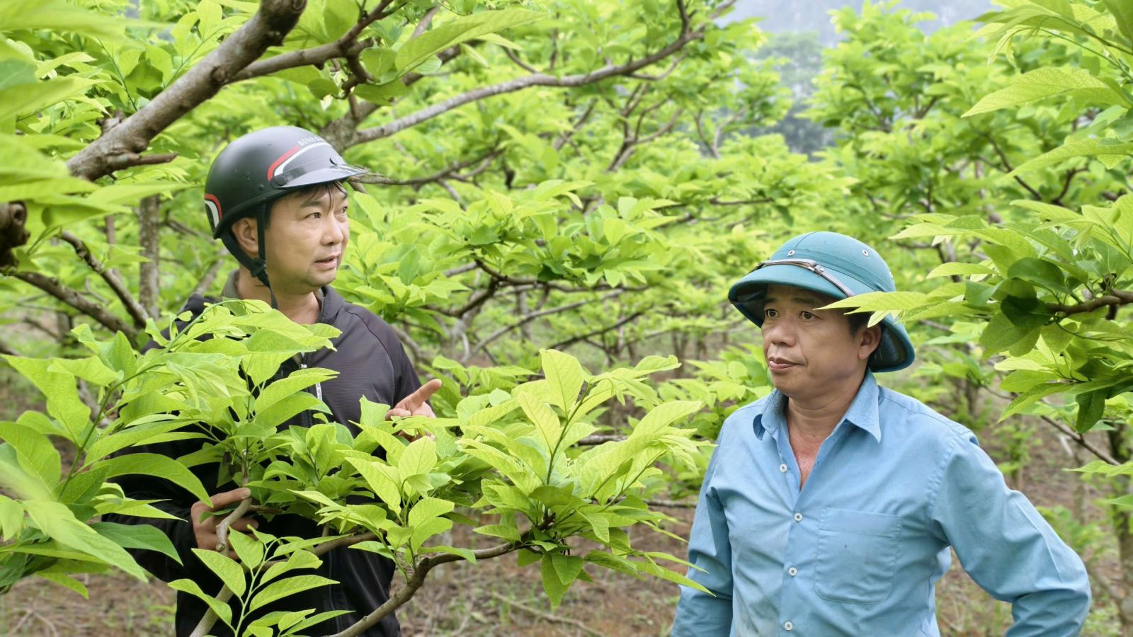 Cán bộ kỹ thuật trao đổi, thảo luận hướng dẫn kỹ thuật cắt tỉa, phòng trừ sâu, bệnh hại trên cây na giai đoạn ra hoa, thụ phấn