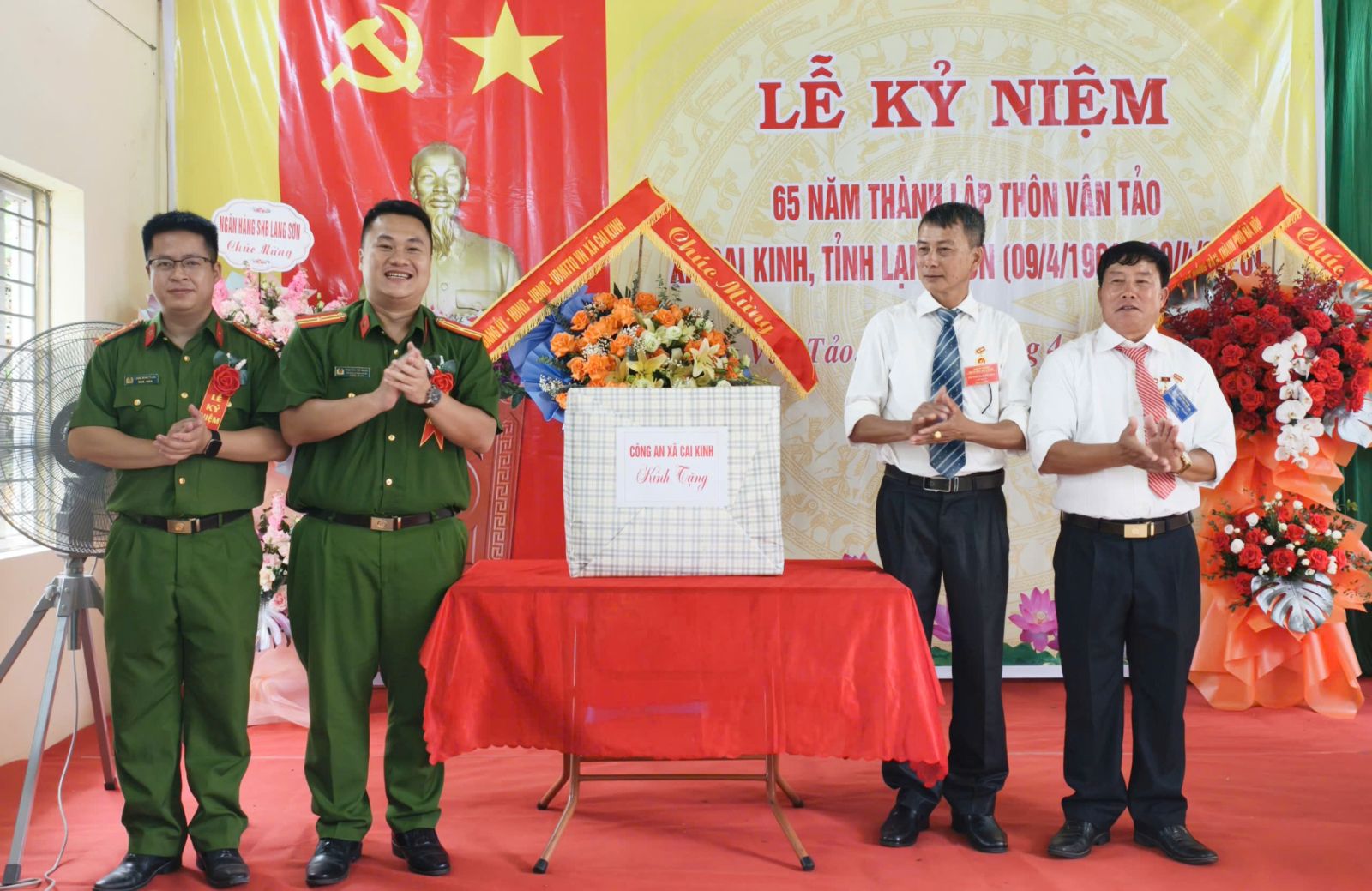 Đại diện Công an xã Cai Kinh tặng hoa, quà chúc mừng