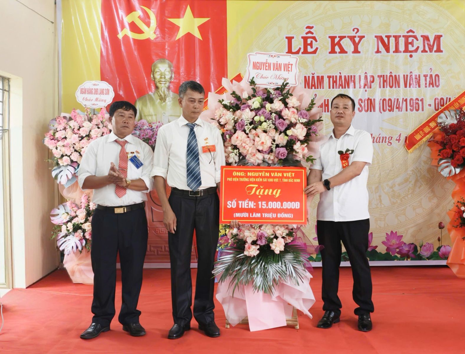Lãnh đạo Đảng uỷ, HĐND, UBND xã Cai Kinh tặng hoa chúc mừng kỷ niệm 65 năm thành lập thôn