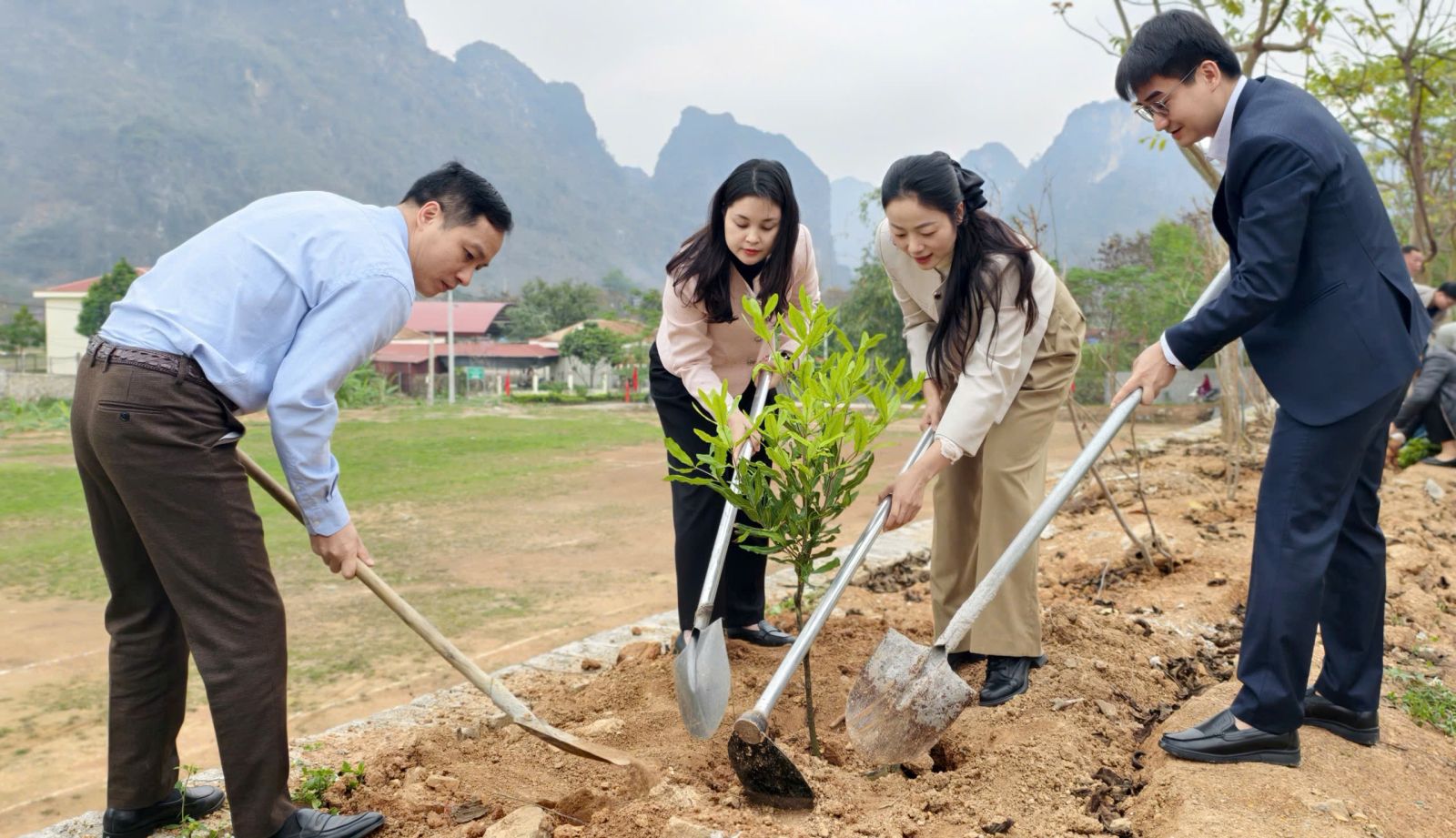 Lãnh đạo Đảng uỷ, UBND cùng đại diện HTX Nông sản Hữu Lũng cùng trồng cây tại Lễ phát động