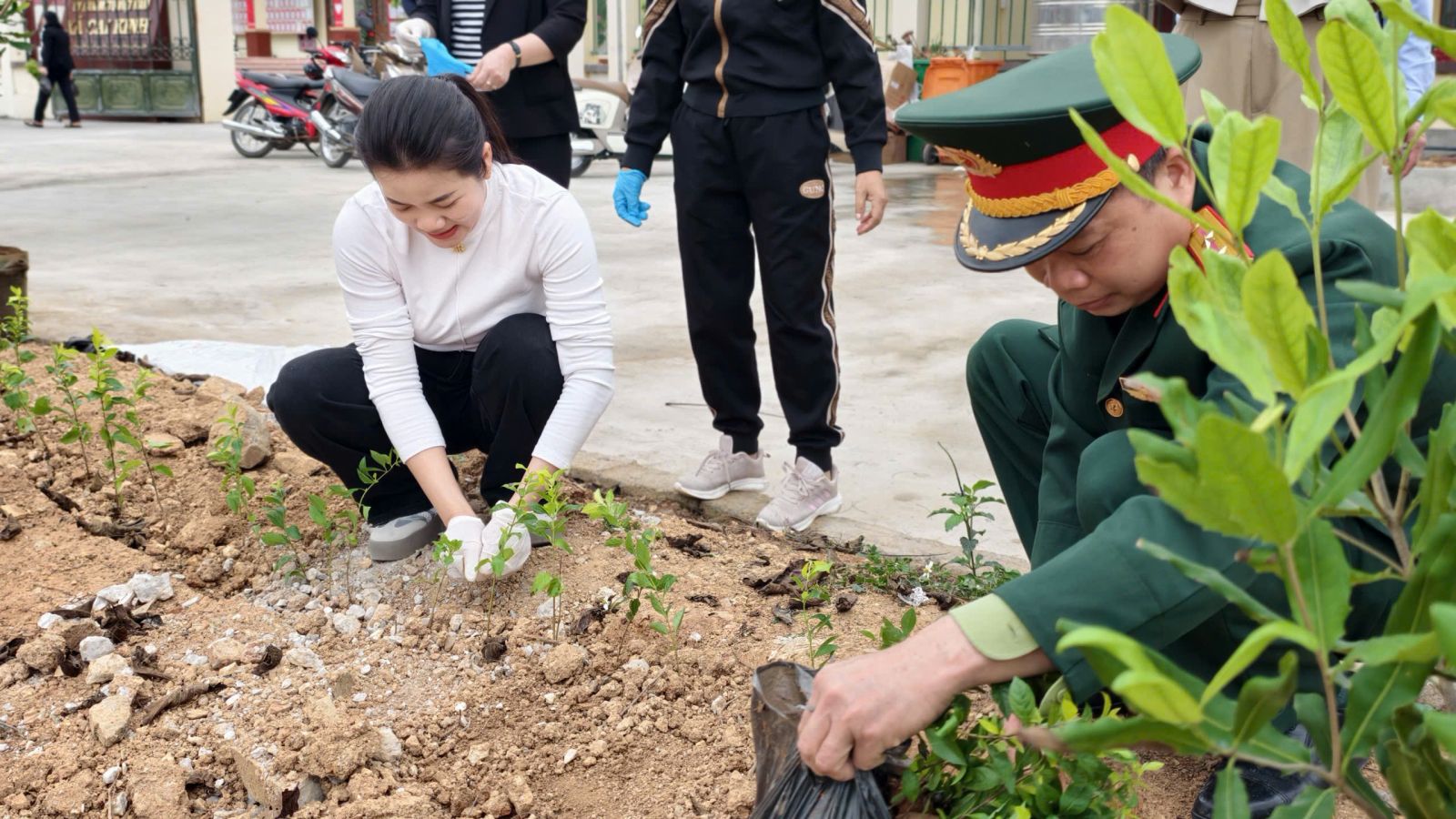 Các đồng chí Lãnh đạo xã trồng cây tại lễ ra quân đầu xuân