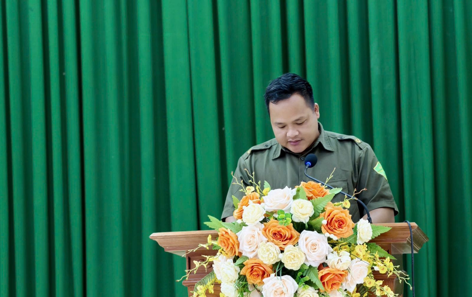 Đại diện Lãnh đạo Công an xã báo cáo tình hình an ninh chính trị, trật tự an toàn xã hội và kết quả xây dựng phong trào Toàn dân bảo vệ ANTQ năm 2025
