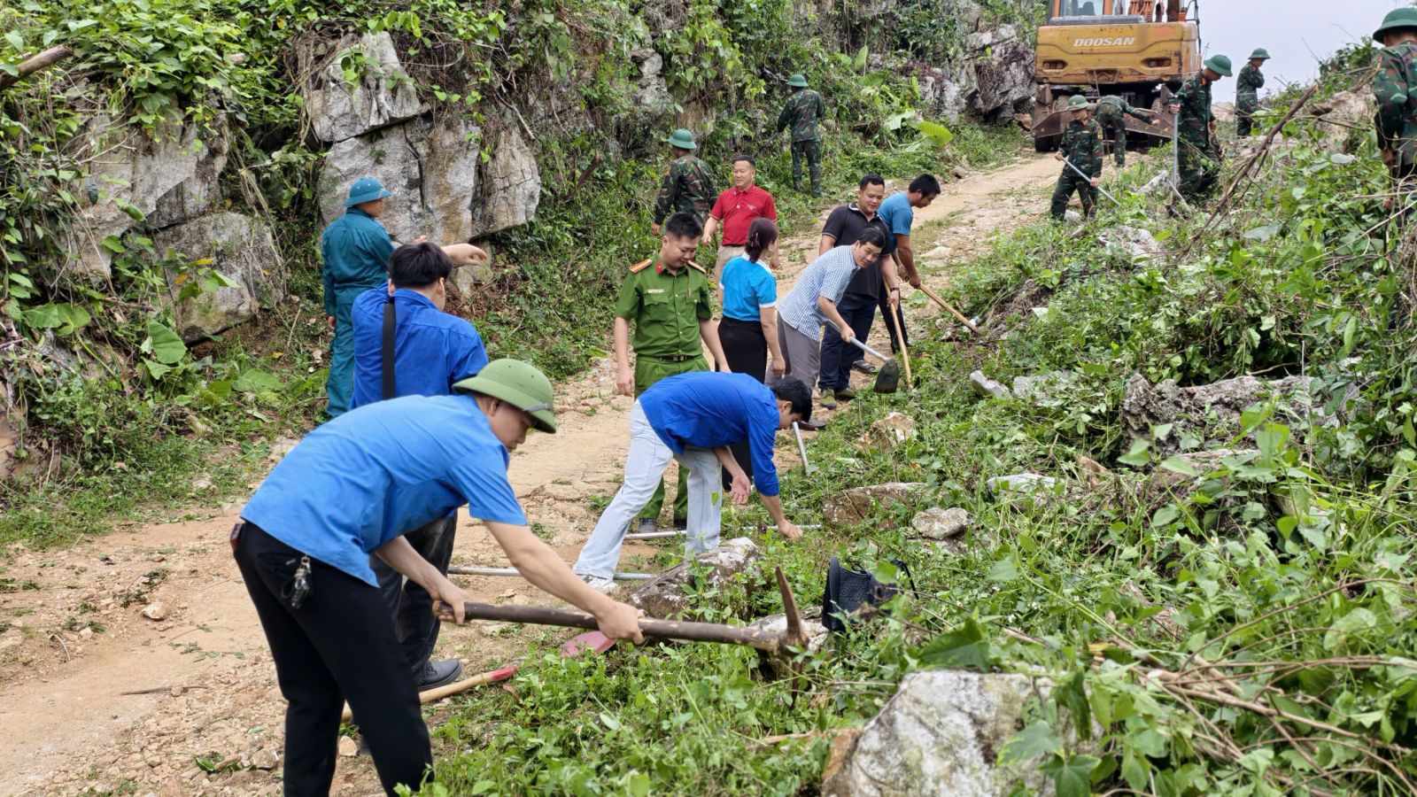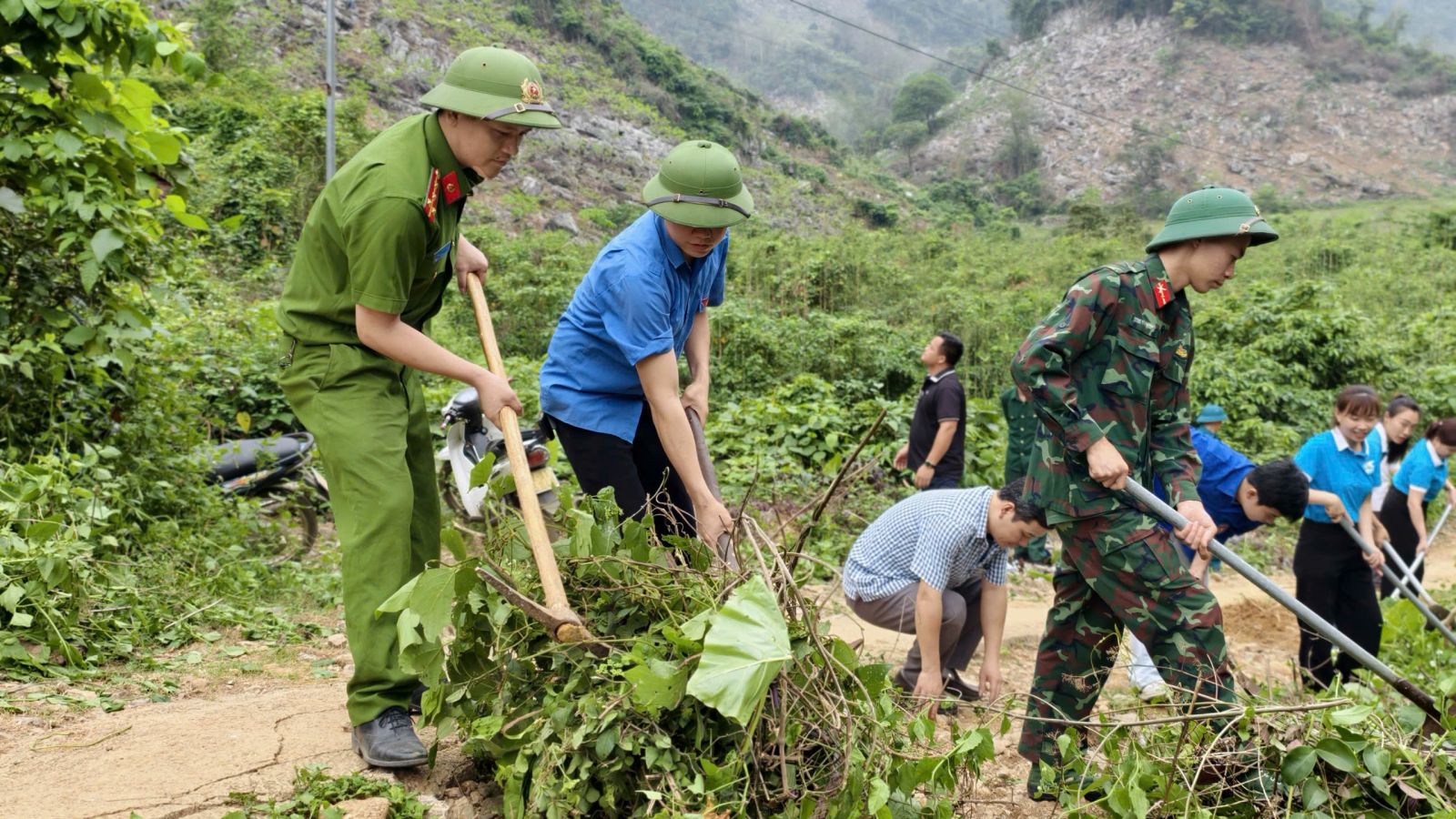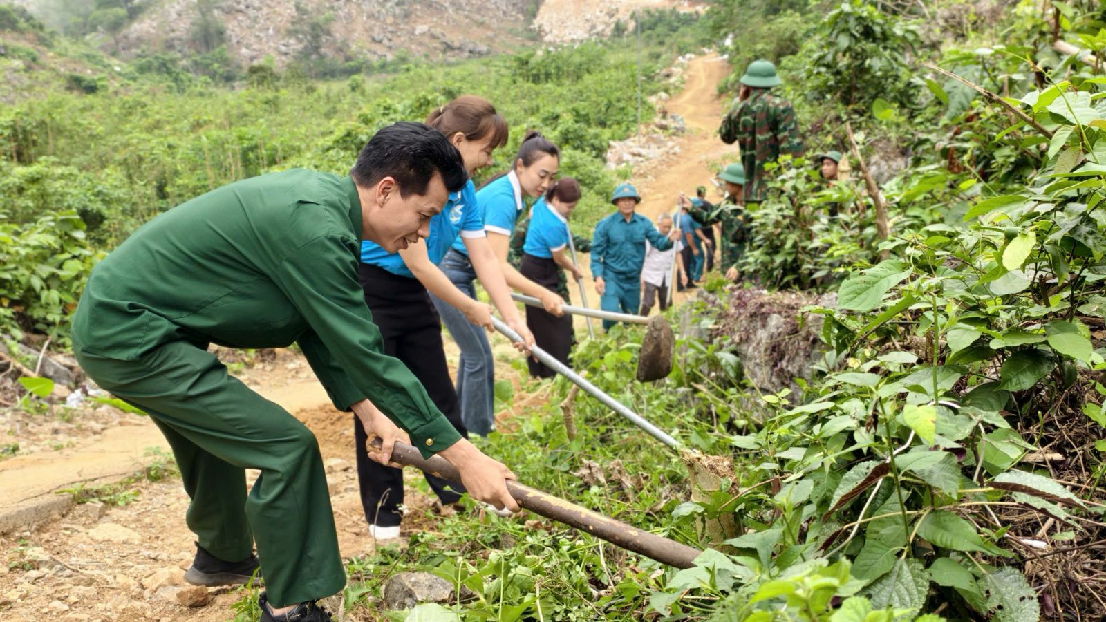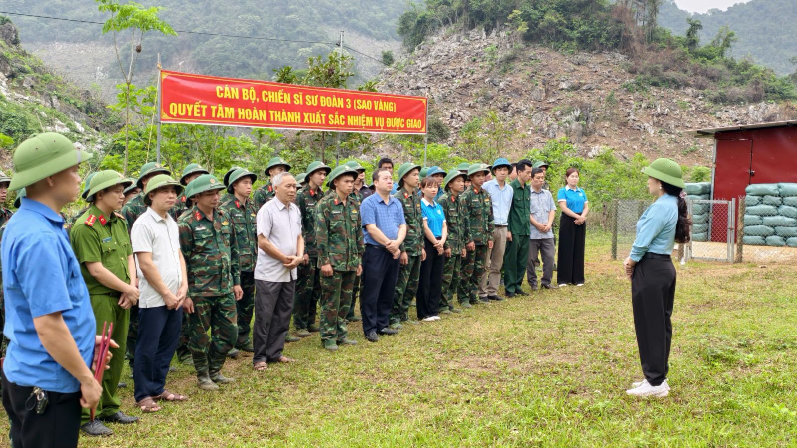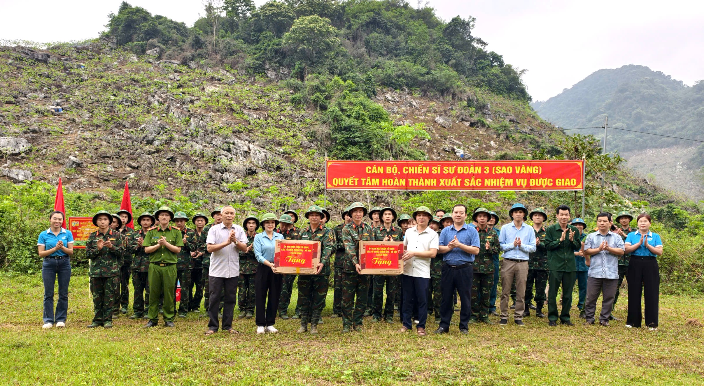 Tại đây, đoàn đã trực tiếp thăm hỏi, động viên cán bộ, chiến sĩ Trung đoàn 123 – Bộ CHQS tỉnh và Sư đoàn 3 đang thực hiện nhiệm vụ dân vận thi công tuyến đường Làng Hao – Lân Nóng; đồng thời cùng tham gia dọn dẹp, tu sửa, mở rộng tuyến đường vào khu dân cư.
