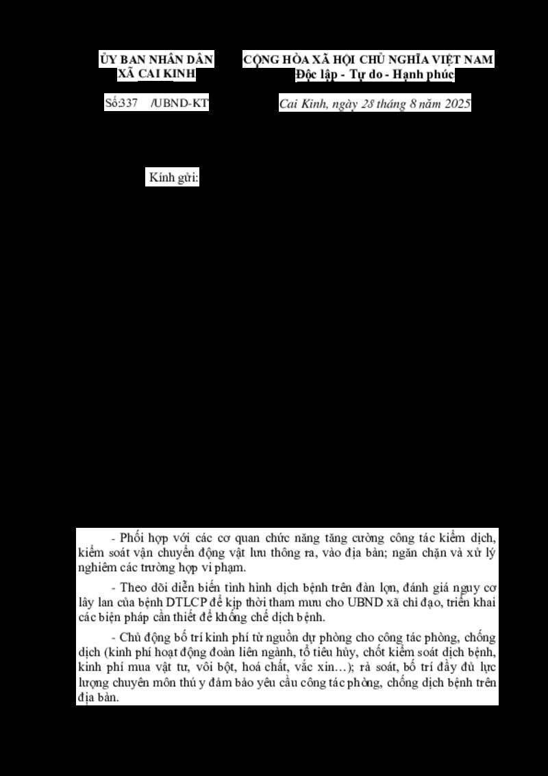 Tiêu đề văn bản | Công văn V/v triển khai quyết liệt, đồng bộ các biện pháp phòng, chống bệnh dịch tả lợn Châu Phi trên địa bàn tỉnh | ||