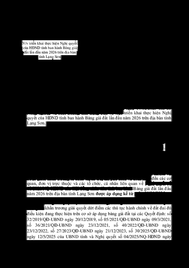 | Tiêu đề văn bản | V/v triển khai thực hiện Nghị quyết của HĐND tỉnh ban hành Bảng giá đất lần đầu năm 2026 trên địa bàn tỉnh Lạng Sơn | ||